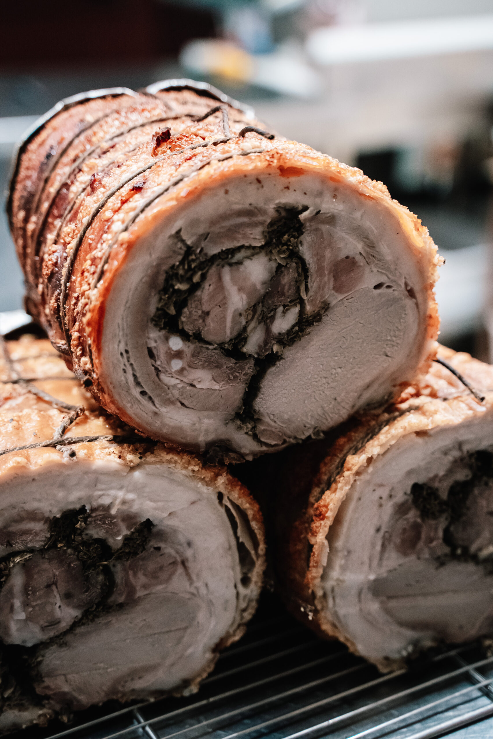 Una porchetta verace, potente e soave, rustica e insieme ricercata. Classica nell’aspetto, ricca di condimento, ha un odore fresco ed esuberante di spezie ed erbe aromatiche (finocchietto, coriandolo, rosmarino, aglio e pepe bianco) unite a buona carne. Bocca intensa, armonica e fragrante, dal morso succoso e scioglievole, con una bella sensazione di grasso preciso e fondente.
